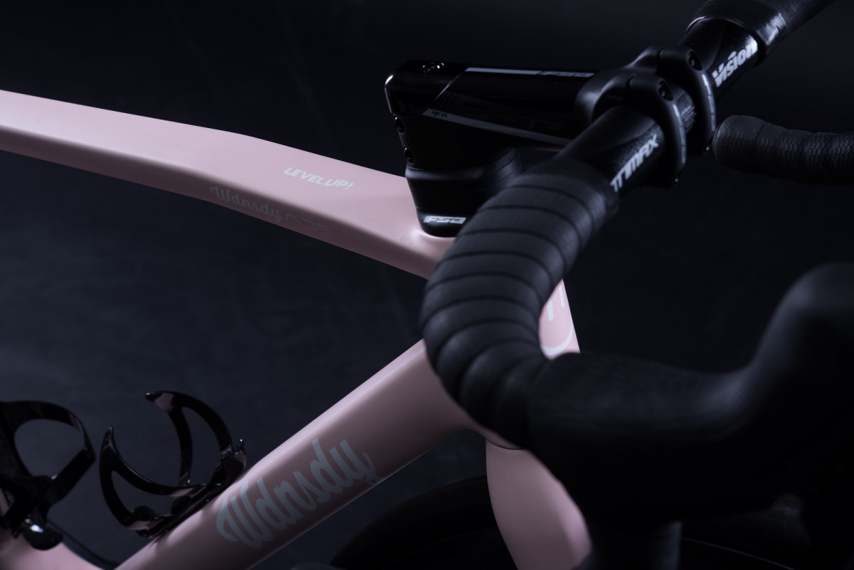 AJ5 SPEK LEBIH BUDGET Wdnsdy AJ5 ini merupakan contoh rakitan lebih terjangkau. Berwarna dusty pink yang sangat anggun, dipadu kokpit alloy FSA ACR dan Vision, dengan grupset Shimano Ultegra 11-speed. Walau stem dan handlebar-nya terpisah, dan grupsetnya mekanikal, tidak sedikit pun kabel terlihat di bagian depan. Sepeda ini dilengkapi dengan wheelset Enve Foundation 45, ban Enve, seatpost dan bottle cage karbon Wdnsdy, plus sadel dan bartape Fabric.